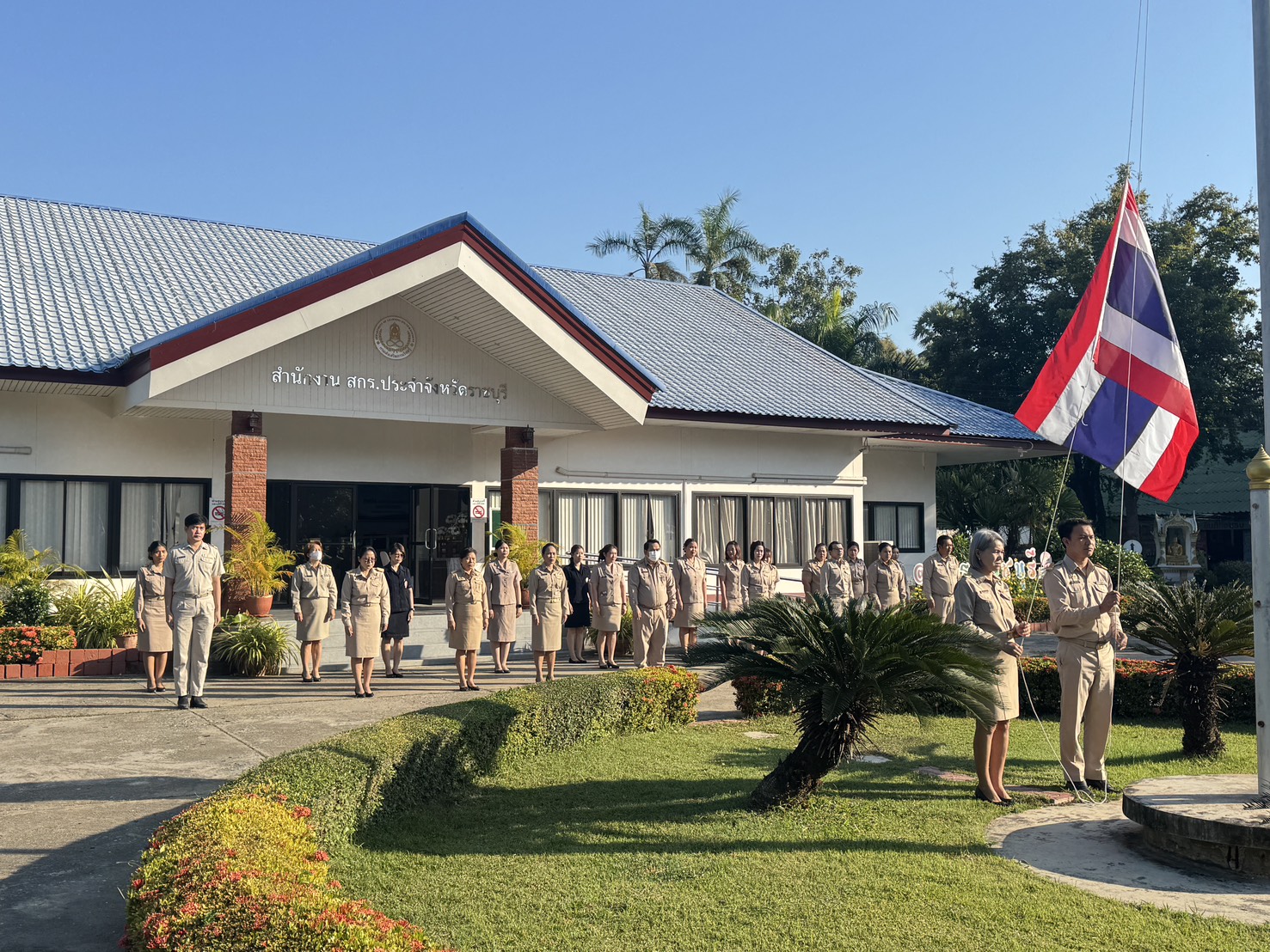 อำนวยการสำนักงานส่งเสริมการเรียนรู้ประจำจังหวัดราชบุรี นำข้าราชการและบุคลากร ผู้ปฏิบัติงาน สำนักงาน สกร.ประจำจังหวัดราชบุรีเข้าร่วมกิจกรรมเข้าแถวเคารพธงชาติ สวดมนต์ไหว้พระ
