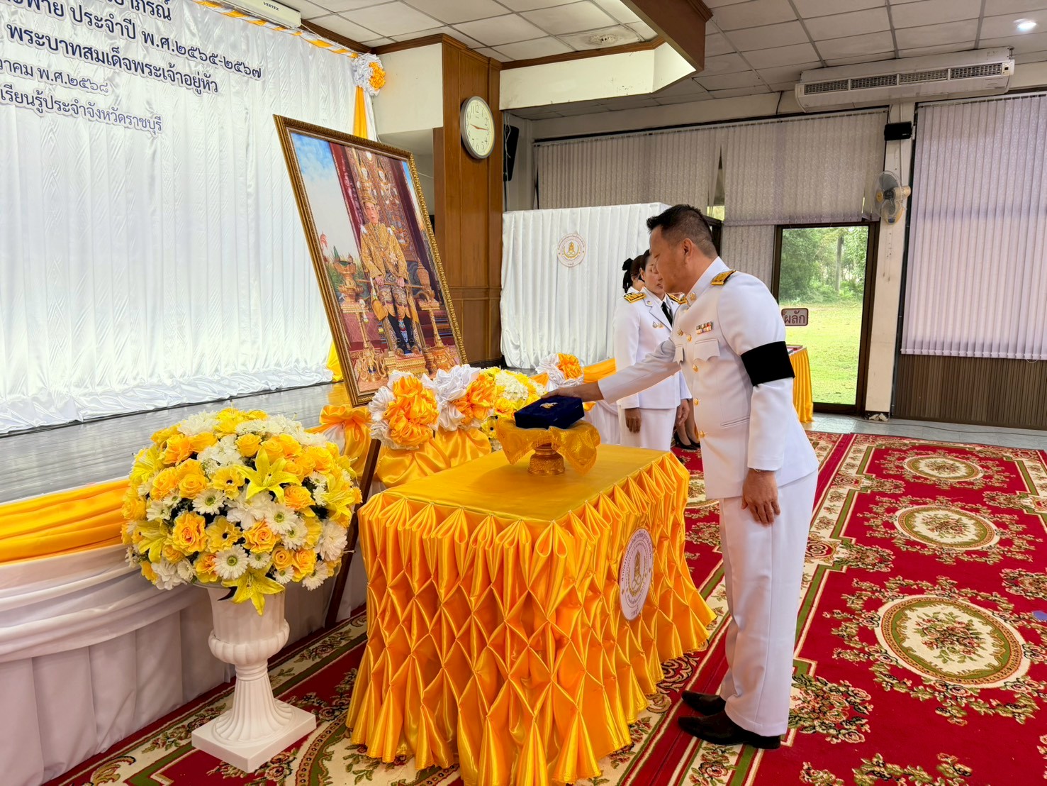 ผู้อำนวยการสำนักงานส่งเสริมการเรียนรู้ประจำจังหวัดราชบุรี เป็นประธานอัญเชิญเครื่องราชอิสริยาภรณ์ ชั้นสายสะพายและชั้นต่ำกว่าสายสะพาย ประจำปี พ.ศ.๒๕๖๕ - ๒๕๖๗ เบื้องหน้าพระบรมฉายาลักษณ์ พระบาทสมเด็จพระเจ้าอยู่หัว